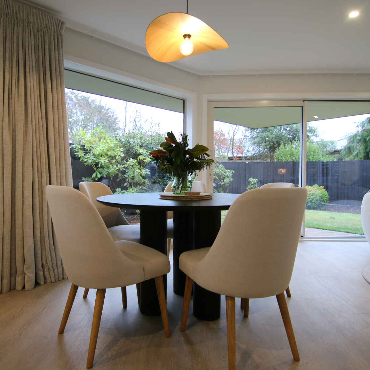 We’ve prioritised the natural light and expansive view by using lightweight curtain fabrics, minimising window coverage during the day with the flexibility of sheers for light filtering and control.